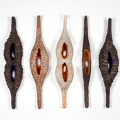 Jill periodically raises silkworms in her studio and has collaborated with them in creating sculpture with chambers for them in which to spin their cocoons. Vessels and necklaces include cocoons from her silkworms, all raised free to mature to silk moths.